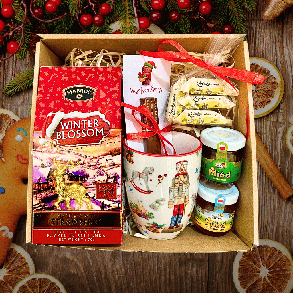 Zestaw, który otuli Cię ciepłem i wprowadzi w magiczną atmosferę świąt! Idealny na prezent dla każdego, kto ceni chwilę relaksu przy filiżance pysznej herbaty, z odrobiną słodyczy i naturalnym miodem.